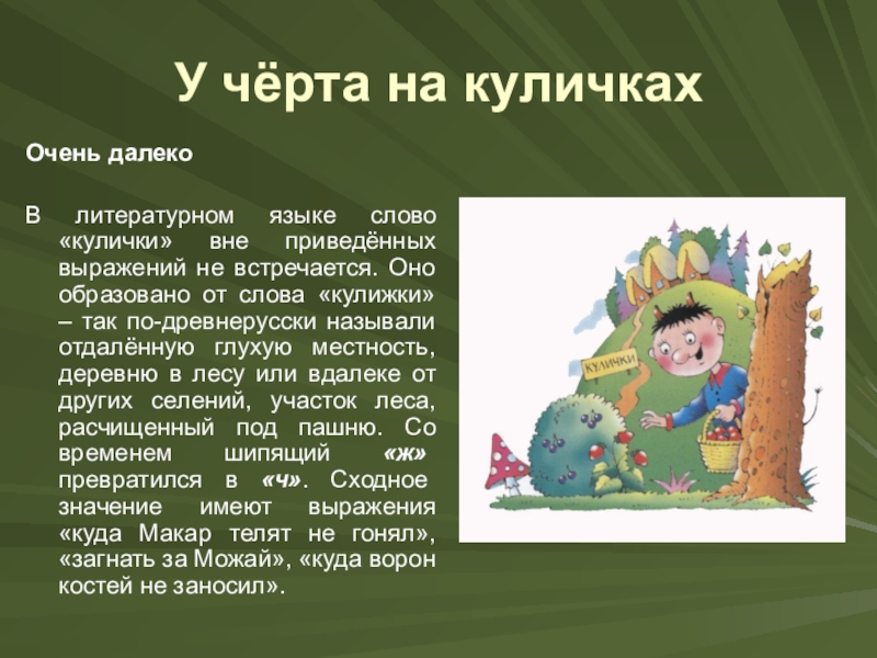 выражений не встречается. Оно образовано от слова «кулижки» – так по-древнерусски называли отдалённую глухую местность, деревню в лесу или вдалеке от других селений, участок леса, расчищенный под пашню. Со временем шипящий «ж» превратился в «ч». Сходное значение имеют выражения «куда Макар телят не гонял», «загнать за Можай», «куда ворон костей не заносил».