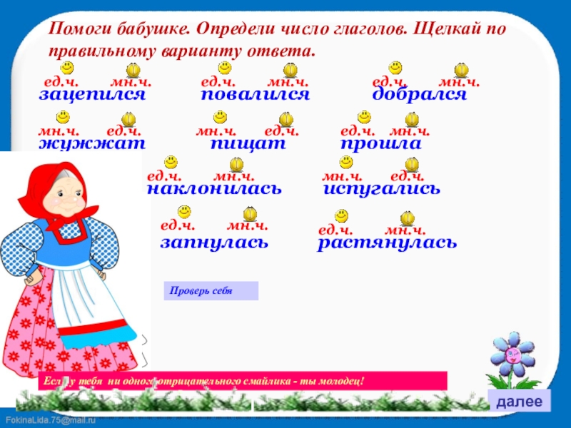 Помоги бабушке. Определи число глаголов. Щелкай по правильному варианту ответа.