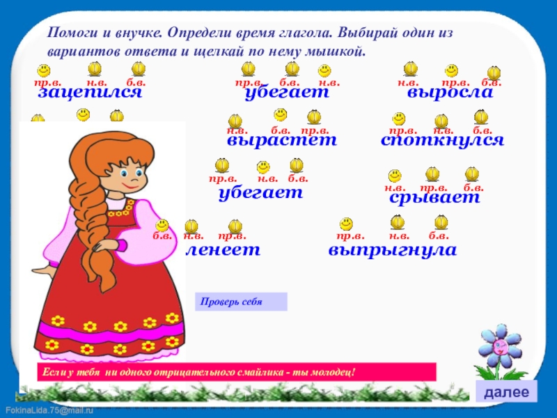 Помоги и внучке. Определи время глагола. Выбирай один из вариантов ответа