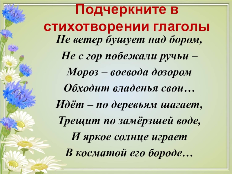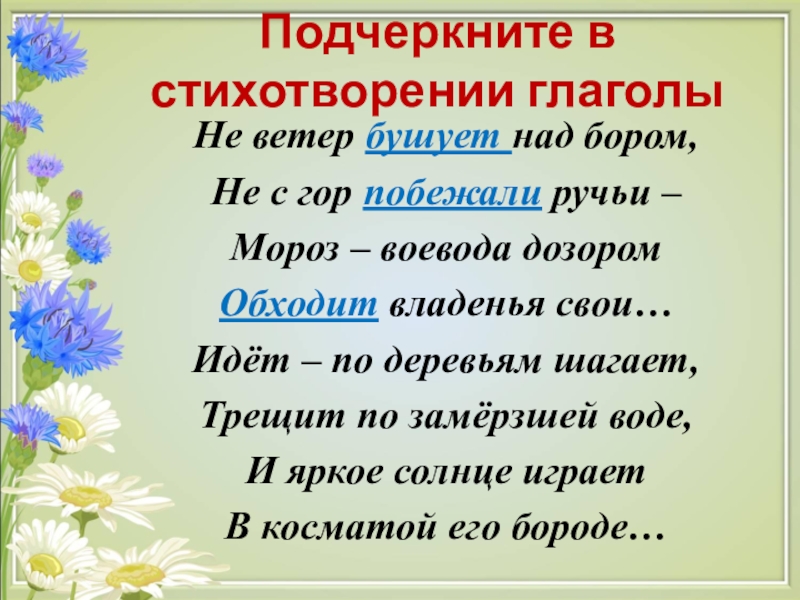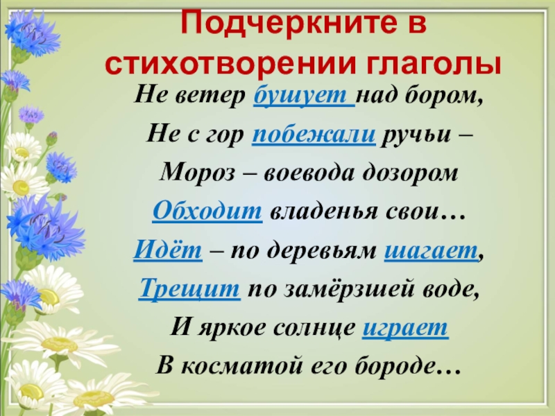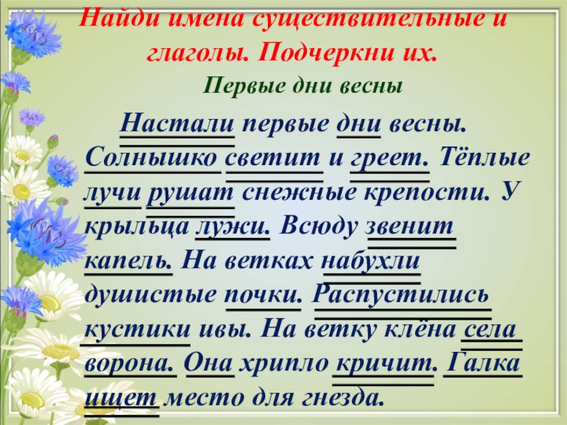 Слайд 14Найди имена существительные и глаголы. Подчеркни их.