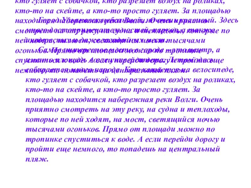 Самое интересное место в городе – это центр, а именно площадь возле университета. Летом здесь собирается много народа. Кто катается на велосипеде, кто гуляет с собачкой, кто разрезает воздух на роликах, кто-то на скейте, а кто-то просто гуляет. За площадью находится набережная реки Волги. Очень приятно смотреть на эту реку, на судна и теплоходы, которые по ней ходят, на мост, светящийся ночью тысячами огоньков. Прямо от площади можно по тропинке спуститься к воде. А если перейди дорогу и пройти еще немного, то попадешь на центральный пляж.
