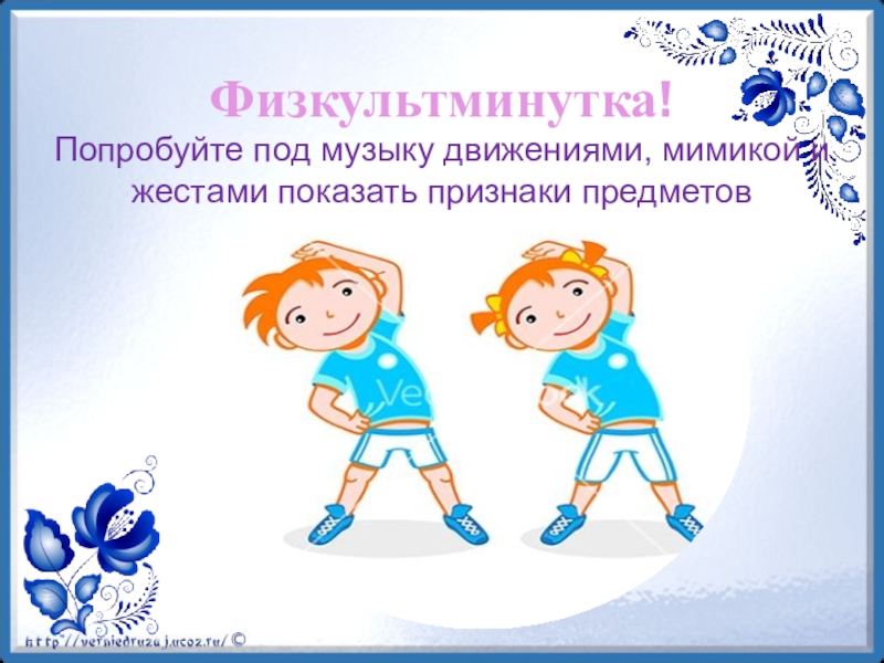 Попробуйте под музыку движениями, мимикой и жестами показать признаки предметов