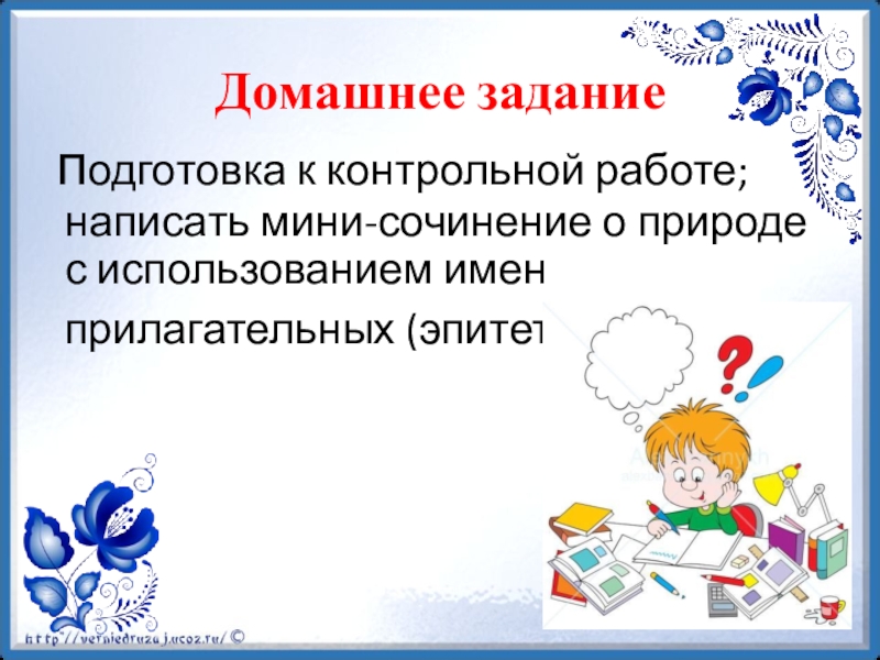 подготовка к контрольной работе; написать мини-сочинение о природе с