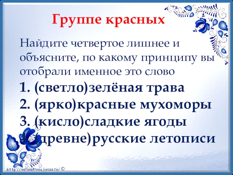 Слайд 5Найдите четвертое лишнее и объясните, по какому принципу вы отобрали именное
