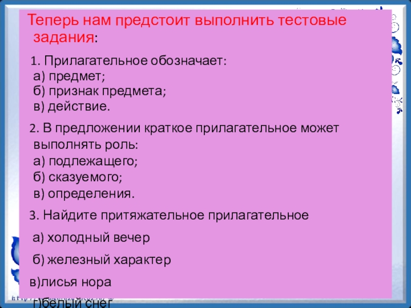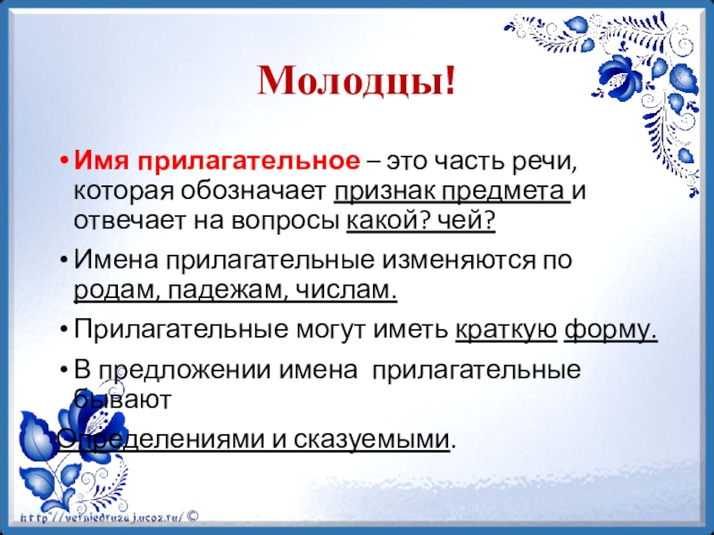 Имя прилагательное – это часть речи, которая обозначает признак предмета и