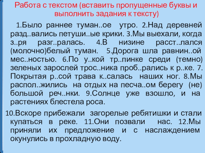 1.Было раннее туман..ое утро. 2.Над деревней разд..вались петуши..ые крики. 3.Мы выехали, когда з..ря разг..ралась. 4.В низине расст..лался (молочно)белый туман. 5.Дорога шла равнин..ой мес..ностью. 6.По у..кой тр..пинке среди (темно)зеленых зарослей трос..ника проб..рались к р..ке. 7.Покрытая р..сой трава к..салась наших ног. 8.Мы распол..жились на отдых на песча..ом берегу (не)большой реч..нки. 9.Солнце уже взошло, и на растениях блестела роса.