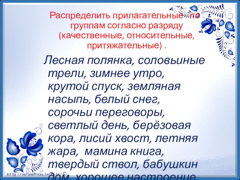 Слайд 20 Распределить прилагательные по группам согласно разряду (качественные, относительные, притяжательные)