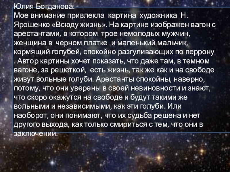 картине изображен вагон с арестантами, в котором трое немолодых мужчин, женщина в черном платке и маленький мальчик, кормящий голубей, спокойно разгуливающих по перрону . Автор картины хочет показать, что даже там, в темном вагоне, за решеткой, есть жизнь, так же как и на свободе живут вольные голуби. Арестанты спокойны, наверно, потому, что они уверены в своей невиновности и знают, что скоро окажутся на свободе и будут такими же вольными и независимыми, как эти голуби. Или наоборот, они понимают, что их судьба решена и нет другого выхода, как только смириться с тем, что они в заключении.
