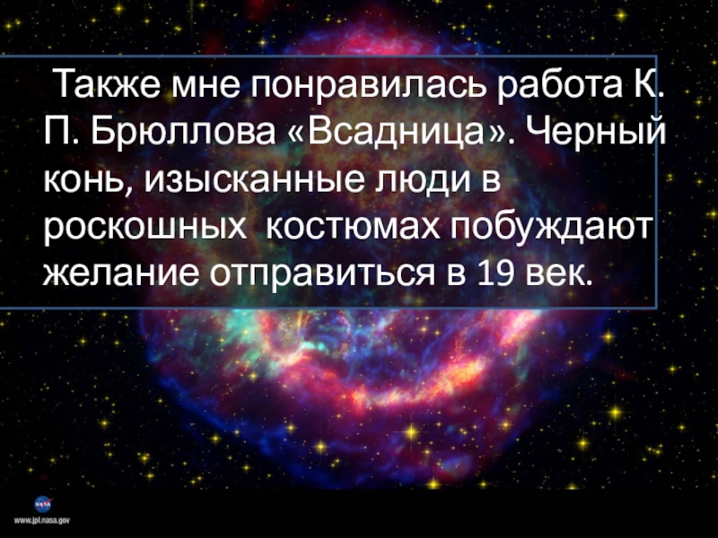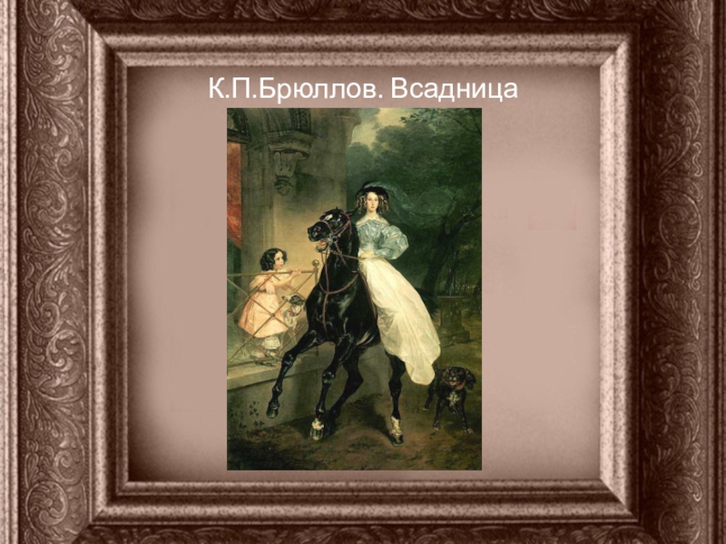 Также мне понравилась работа К.П. Брюллова «Всадница». Черный конь, изысканные