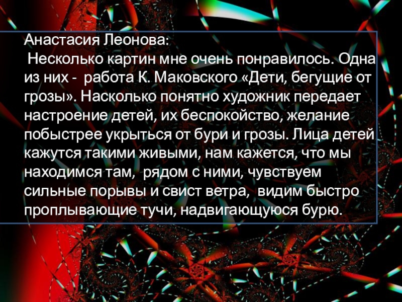 работа К. Маковского «Дети, бегущие от грозы». Насколько понятно художник передает настроение детей, их беспокойство, желание побыстрее укрыться от бури и грозы. Лица детей кажутся такими живыми, нам кажется, что мы находимся там, рядом с ними, чувствуем сильные порывы и свист ветра, видим быстро проплывающие тучи, надвигающуюся бурю.