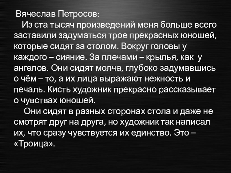 всего заставили задуматься трое прекрасных юношей, которые сидят за столом. Вокруг головы у каждого – сияние. За плечами – крылья, как у ангелов. Они сидят молча, глубоко задумавшись о чём – то, а их лица выражают нежность и печаль. Кисть художник прекрасно рассказывает о чувствах юношей.
