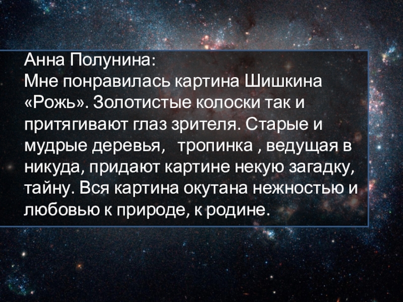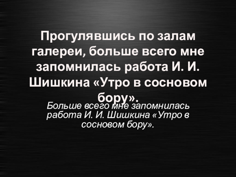 Слайд 46Прогулявшись по залам галереи, больше всего мне запомнилась работа И. И.
