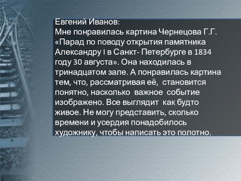 Александру I в Санкт- Петербурге в 1834 году 30 августа». Она находилась в тринадцатом зале. А понравилась картина тем, что, рассматривая её, становится понятно, насколько важное событие изображено. Все выглядит как будто живое. Не могу представить, сколько времени и усердия понадобилось художнику, чтобы написать это полотно.