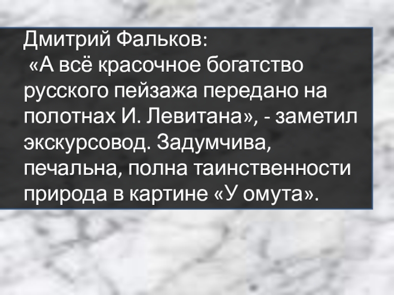 полотнах И. Левитана», - заметил экскурсовод. Задумчива, печальна, полна таинственности природа в картине «У омута».