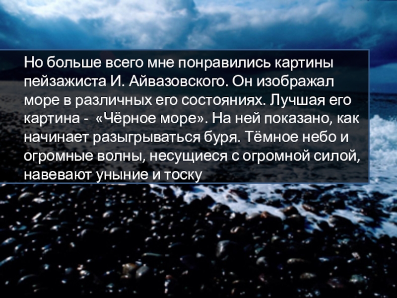 Но больше всего мне понравились картины пейзажиста И. Айвазовского. Он изображал