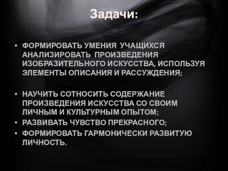 ФОРМИРОВАТЬ УМЕНИЯ УЧАЩИХСЯ АНАЛИЗИРОВАТЬ ПРОИЗВЕДЕНИЯ ИЗОБРАЗИТЕЛЬНОГО ИСКУССТВА, ИСПОЛЬЗУЯ ЭЛЕМЕНТЫ ОПИСАНИЯ