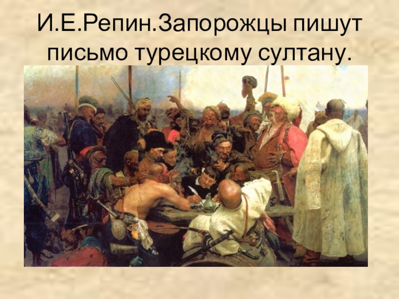 Слайд 62И.Е.Репин.Запорожцы пишут письмо турецкому султану.