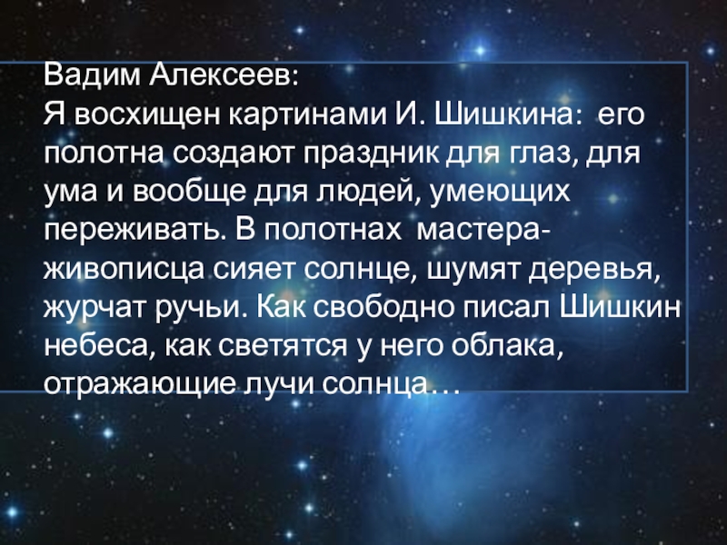 Я восхищен картинами И. Шишкина: его полотна создают праздник для