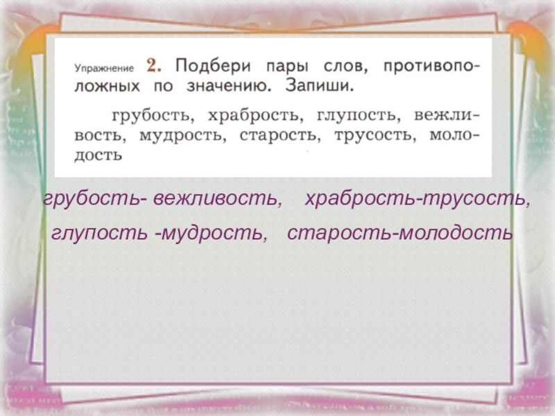 грубость- вежливость,храбрость-трусость,глупость -мудрость,старость-молодость