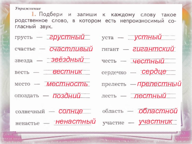 Рабочий слайд.Вариант 2.грустныйсчастливыйзвёздныйвестникместностьпозднийсолнцененастныйустныйгигантскийчестныйсердцепрелестныйлестныйобластнойучастник