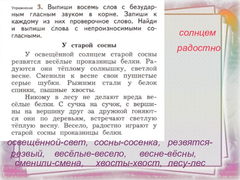 освещённой-свет,сосны-сосенка,резвятся-резвый,весёлые-весело,весне-вёсны,сменили-смена,хвосты-хвост,лесу-лессолнцемрадостно