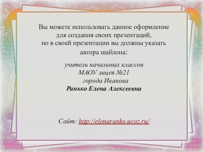 Вы можете использовать данное оформление для создания своих презентаций, но в своей презентации вы должны указать автора