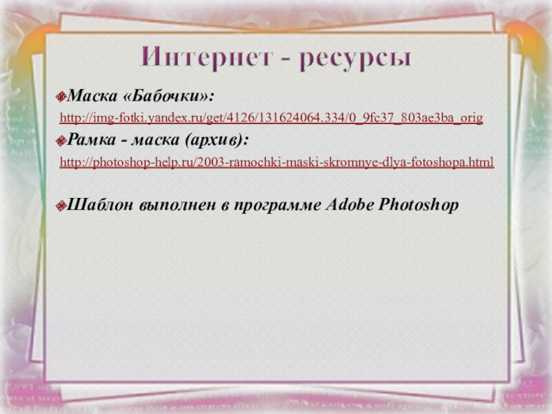 Маска «Бабочки»:http://img-fotki.yandex.ru/get/4126/131624064.334/0_9fc37_803ae3ba_origРамка - маска (архив): http://photoshop-help.ru/2003-ramochki-maski-skromnye-dlya-fotoshopa.html Шаблон выполнен в программе Adobe Photoshop