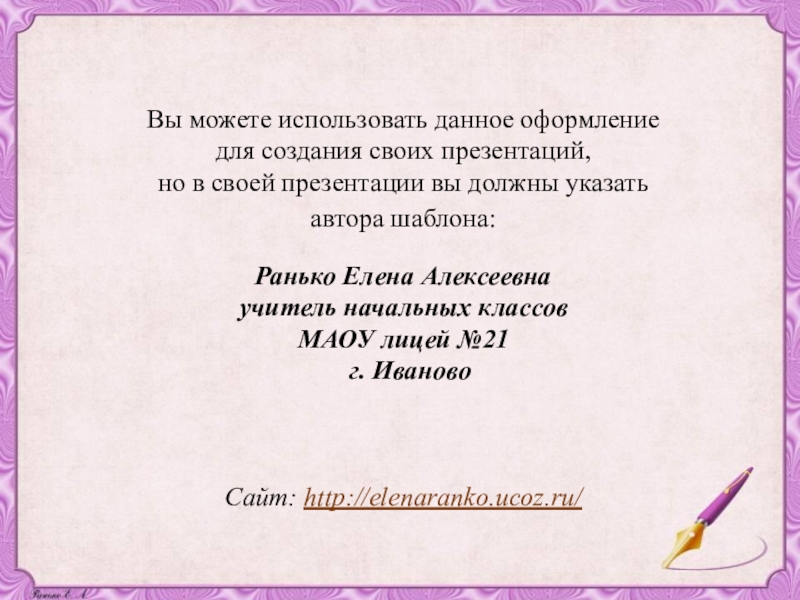 Вы можете использовать данное оформление для создания своих презентаций, но в своей презентации вы должны указать автора