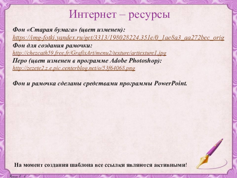 На момент создания шаблона все ссылки являются активными! Интернет – ресурсыФон «Старая бумага» (цвет изменен):  https://img-fotki.yandex.ru/get/3313/198028224.351e/0_1ae8a3_aa272bec_orig