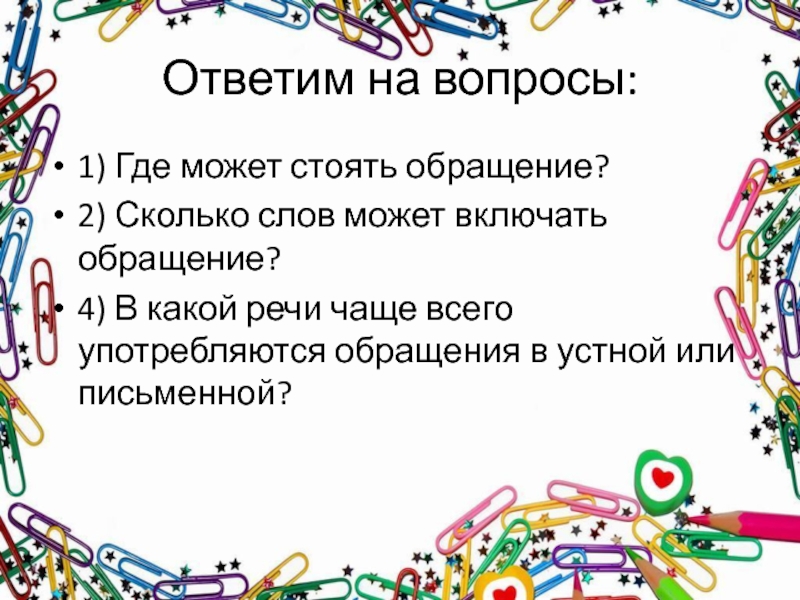 Ответим на вопросы:1) Где может стоять обращение?2) Сколько слов может включать обращение?4) В какой речи чаще всего