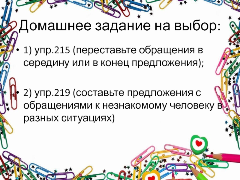 Домашнее задание на выбор:1) упр.215 (переставьте обращения в середину или в конец предложения); 2) упр.219 (составьте предложения