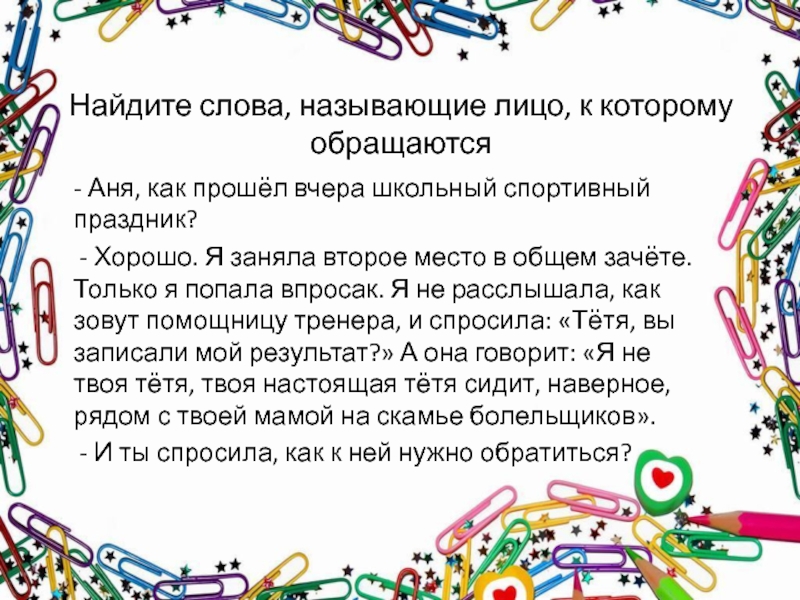 Найдите слова, называющие лицо, к которому обращаются- Аня, как прошёл вчера школьный спортивный праздник? - Хорошо. Я