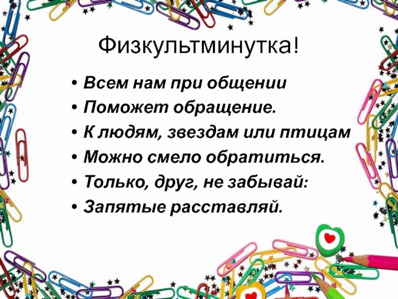 Физкультминутка!Всем нам при общенииПоможет обращение.К людям, звездам или птицамМожно смело обратиться.Только, друг, не забывай:Запятые расставляй.