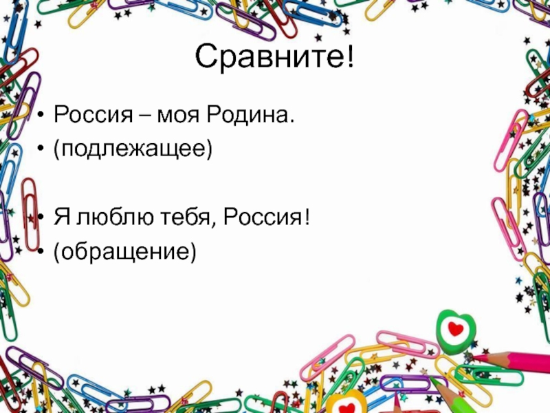 Сравните!Россия – моя Родина.(подлежащее)Я люблю тебя, Россия!(обращение)
