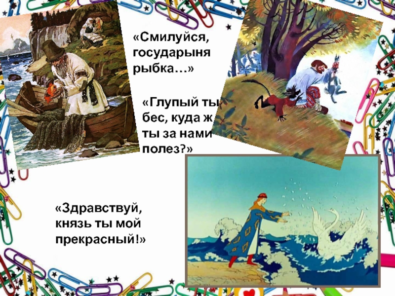 «Смилуйся, государыня рыбка…»«Глупый ты бес, куда ж ты за нами полез?»«Здравствуй, князь ты мой прекрасный!»