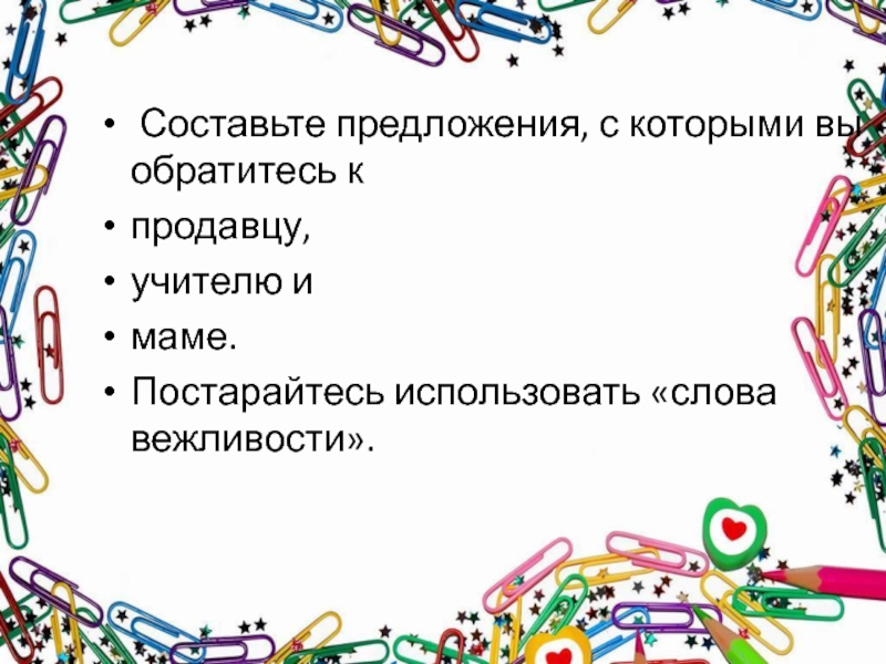 Составьте предложения, с которыми вы обратитесь к продавцу, учителю и маме. Постарайтесь использовать «слова вежливости».