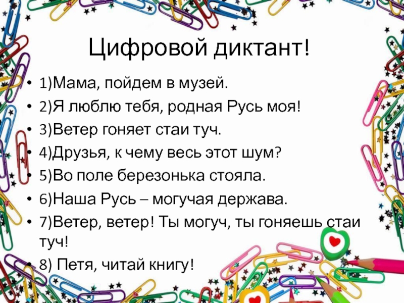 Цифровой диктант!1)Мама, пойдем в музей.2)Я люблю тебя, родная Русь моя!3)Ветер гоняет стаи туч.4)Друзья, к чему весь этот