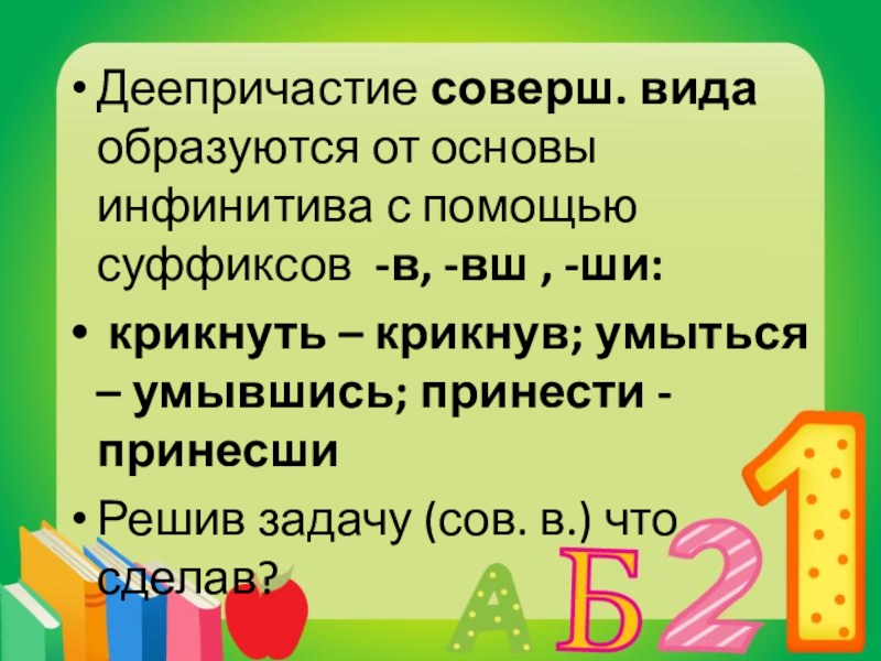 Слайд 10Деепричастие соверш. вида образуются от основы инфинитива с помощью суффиксов -в,