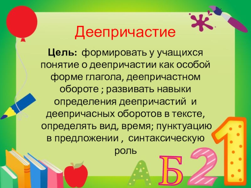 Цель: формировать у учащихся понятие о деепричастии как особой форме глагола,