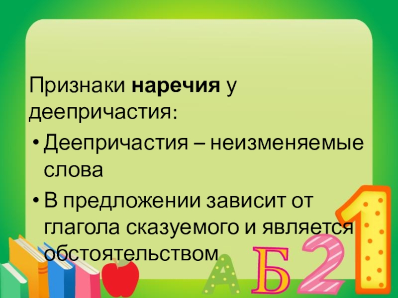 основном действии, объединяет признаки глагола и наречия, выраженном глаголом, и отвечает на вопросы что делая? что сделав?как? каким образом? почему? когда?
