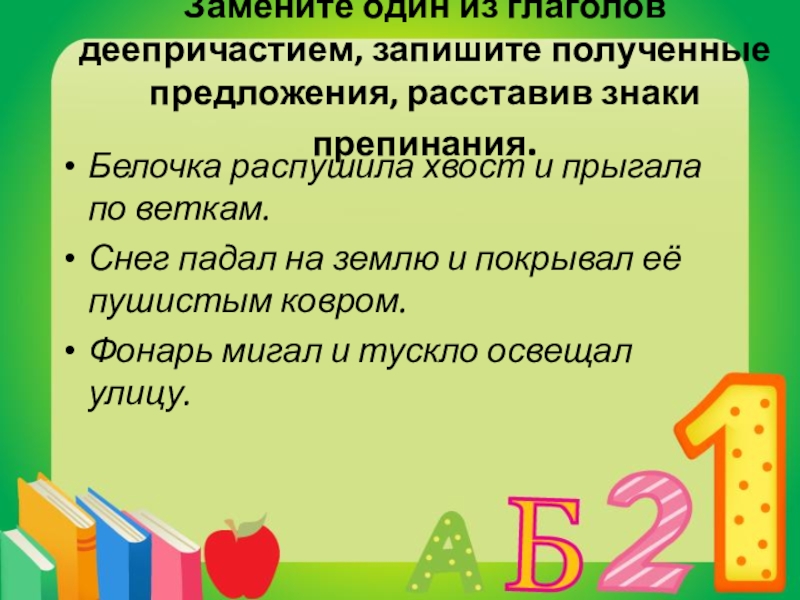 Слайд 15Замените один из глаголов деепричастием, запишите полученные предложения, расставив знаки препинания.