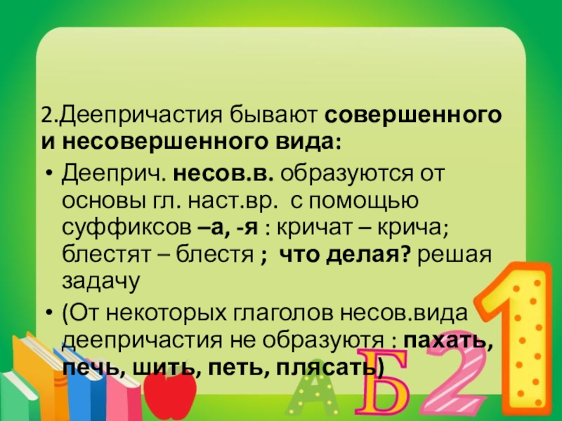 Слайд 92.Деепричастия бывают совершенного и несовершенного вида: