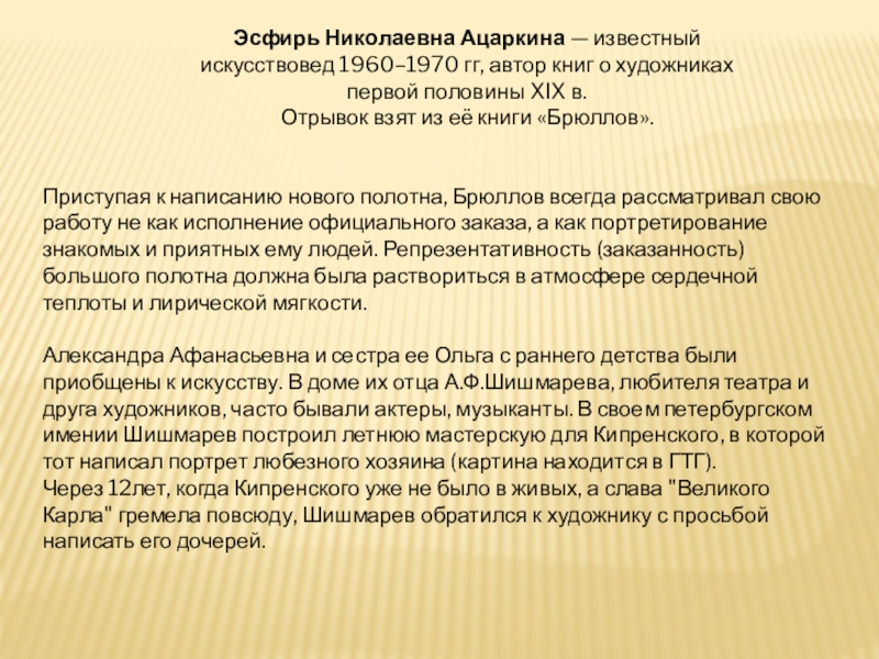 Эсфирь Николаевна Ацаркина — известный искусствовед 1960–1970 гг, автор книг о художниках первой половины XIX в.