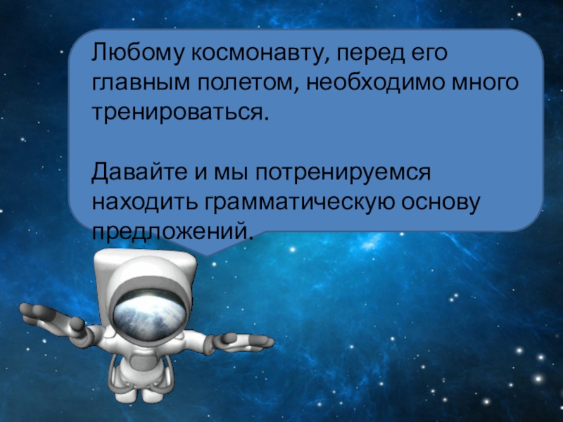 Любому космонавту, перед его главным полетом, необходимо много тренироваться.Давайте и мы потренируемся находить грамматическую основу предложений.
