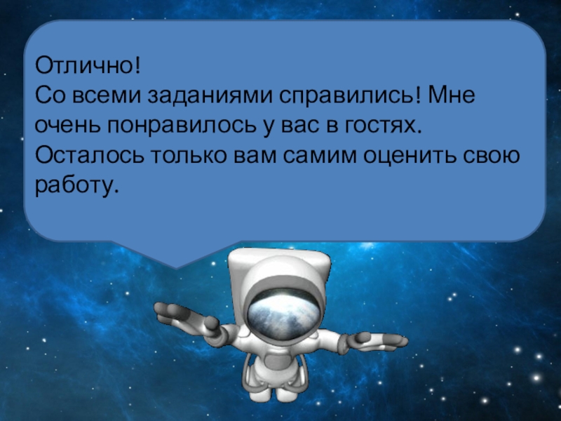 Отлично!Со всеми заданиями справились! Мне очень понравилось у вас в гостях. Осталось только вам самим оценить свою