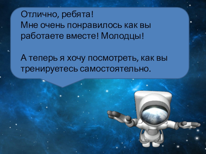 Отлично, ребята!Мне очень понравилось как вы работаете вместе! Молодцы!А теперь я хочу посмотреть, как вы тренируетесь самостоятельно.