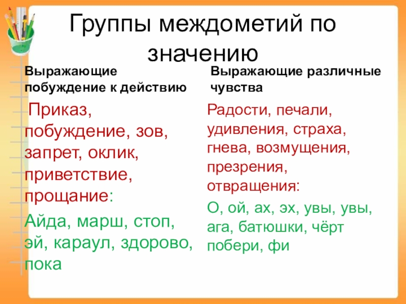 О, ой, ах, эх, увы, увы, ага, батюшки, чёрт побери, фи