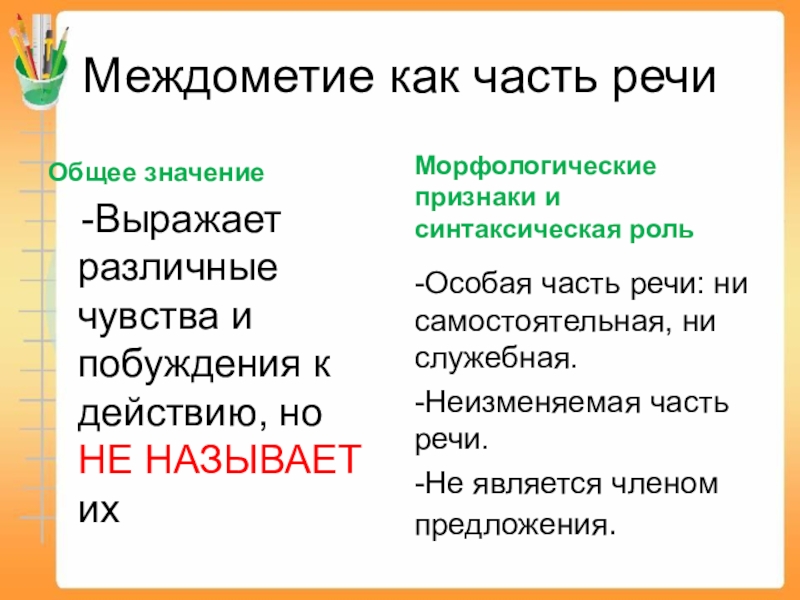 -Особая часть речи: ни самостоятельная, ни служебная.