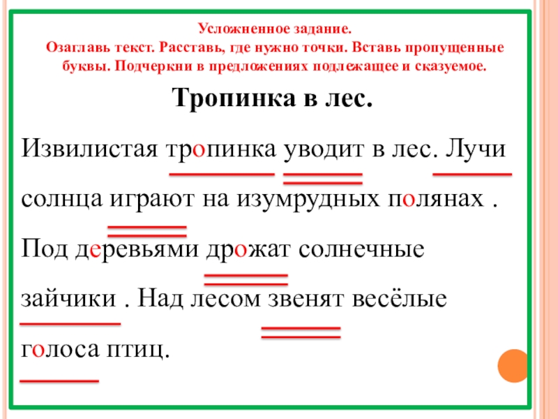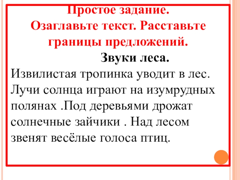 Извилистая тропинка уводит в лес. Лучи солнца играют на изумрудных полянах . Под деревьями дрожат солнечные зайчики . Над лесом звенят весёлые голоса птиц.