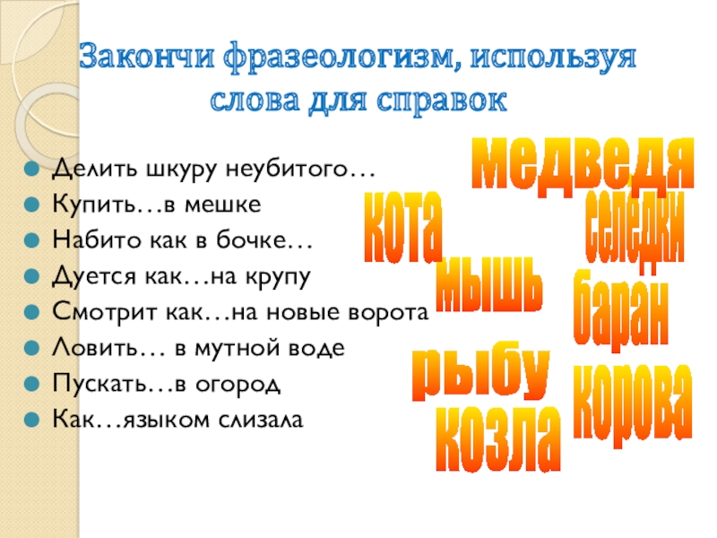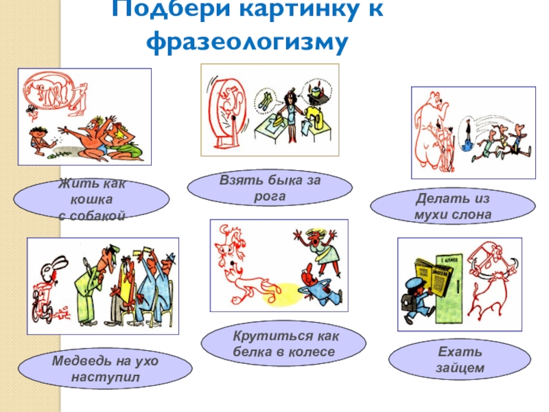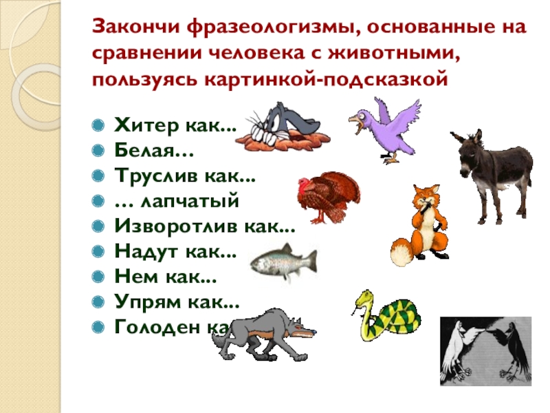 Закончи фразеологизмы, основанные на сравнении человека с животными, пользуясь картинкой-подсказкой